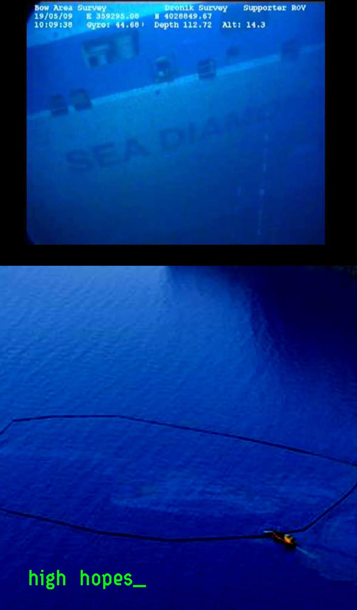 The submerged Sea Diamond shipwreck has remained in the caldera for many years. Cordoned off with cables above the sea, the outline of its shape is visible from the terrace of the venue. This mixed media installation interacts with light, sound and the presence of visitors to disappear and re-emerg.