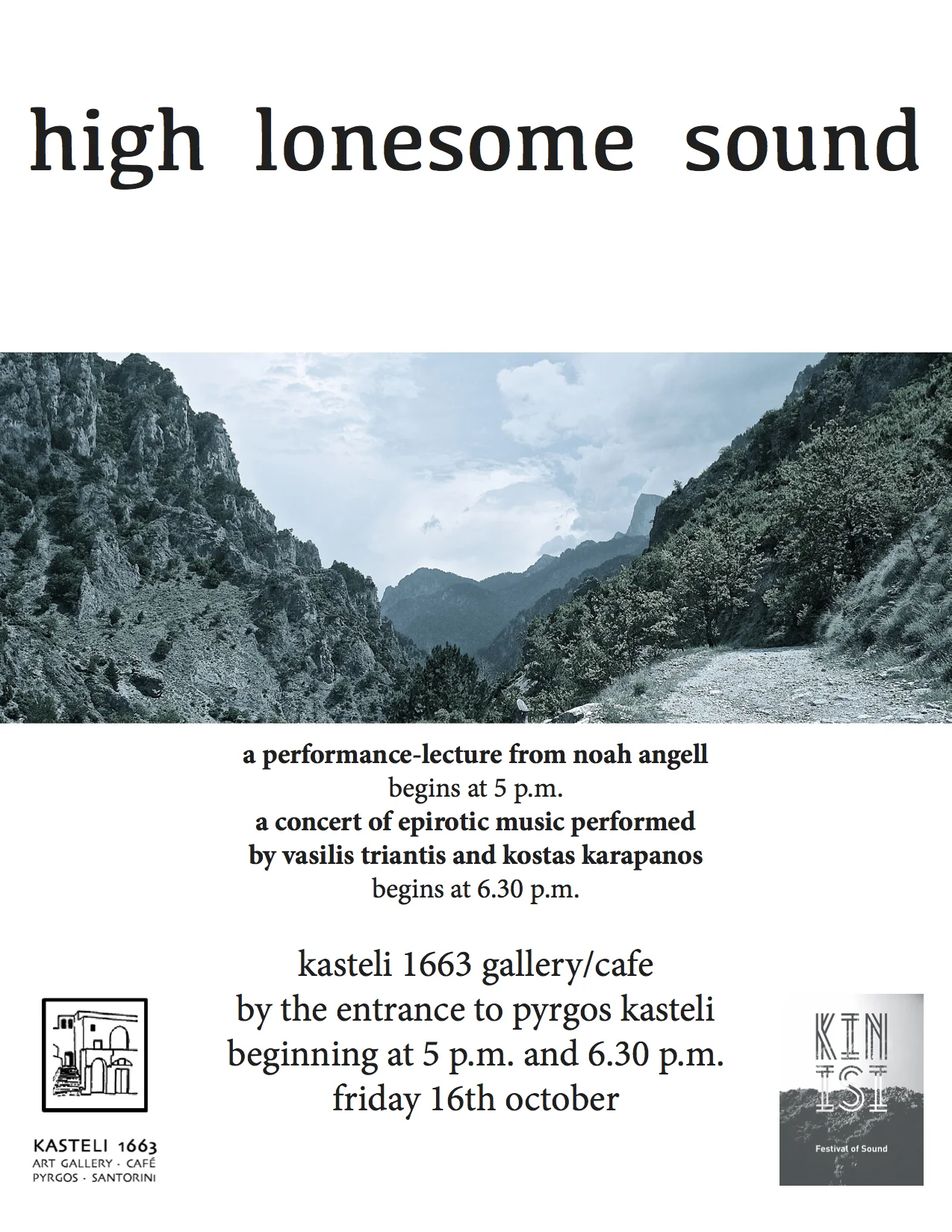 In his performance-lecture In a Cell Lit by Singing Fireflies Noah Angell guided us "through an auditory cinema of desire, distance and bodily rhythm." His lecture featured ethnographic field recordings from Papua New Guinea, Bulgaria, France, Mississippi and more. Vasilis Triantis and Kostas Karapanos are widely recognised masters of the Epirotic tradition, their lute and fiddle took us on a journey through the depths and heights of human emotion, that high lonesome sound of the Greek mountains.