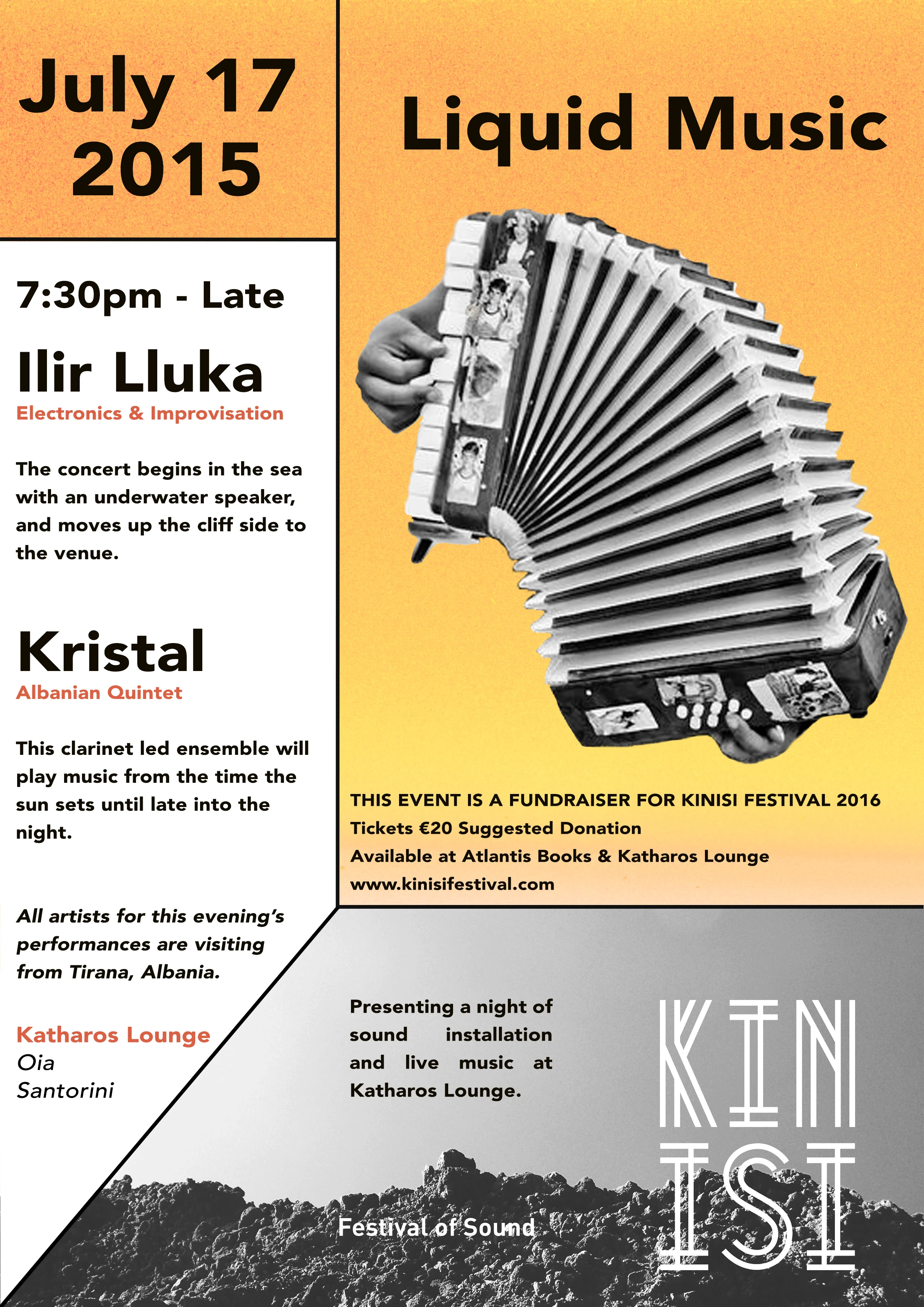 Kinisi is hosted its first event at the Katharos Lounge, Oia, Santorini. We invited Ilir Lluka and the band Kristal from Tirana, Albania. Ilir Lluka is a writer, sound artist and composer. He creates 'soundworks built through a textural combination of processed field-recordings, electronic sounds, and acoustic instruments.' You can find out more about him on his website and listen to his releases here. The members of clarinet led quintet Kristal were once part of the renowned ensemble Migjeni, in 1997 they formed Kristal, they have participated in many national and international festivals following the beat of traditional Albanian wedding music. We met both Ilir and the members of Kristal on our last research trip to Albania, we were fascinated by the work Ilir was doing and charmed by the liquid sound of Kristal's music.